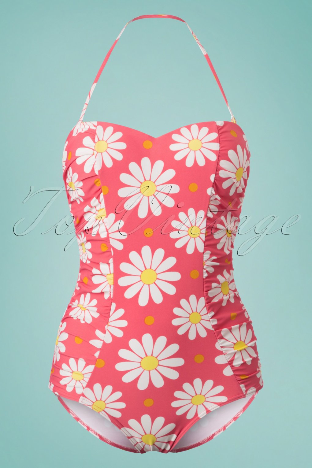 50s Crazy Daisy Halter Swimsuit in Coral Pink