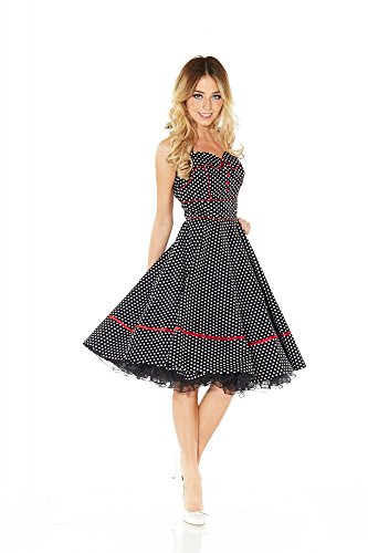 Wunderschönes Petticoat-Kleid im angesagten Stil der 50er Jahre mit weit schwingendem Rock.Topqualität! Tolles Tragegefühl!Hinweis:Anders als bei anderen Anbietern wird ein vollwertiger Petticoat bei unseren Kleidern mitgeliefert.Farben:Schwarz/Rot/WeißMaterial:Kleid: 90% Baumwolle, 10% Polyester, Rock: 100% PolyesterLieferumfang:- Neckholder-Kleid- Petticoat