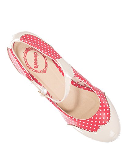 Wunderschöne High Heels von Dancing Days, der neuen Marke von BannedIn einem kräftigem Rotton oder in dunklem Mintfarben mit weißen Pünktchen Mit verstellbarem Riemchen zu schließenEinsätze aus Lack, in cremefarben, im Budapester Brogue StilAbsatzhöhe hinten ca. 10cmAbsatzhöhe vorne ca. 1,5cmGepolsterte Innensohle für mehr TragekomfortToller Farbton!!