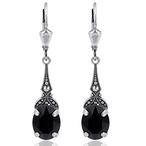 Jugendstil Ohrringe von NOBEL SCHMUCK made with Swarovski Elements. Elegante, zierliche Ohrringe mit einem ovalen Swarovski Kristall in Jet in antik versilberter Fassung. Die Ohrringe haben einen praktischen Brisurverschluß, der verhindert, dass Sie den Schmuck z. B. beim Umziehen verlieren. Der Ohrhaken besteht aus 925iger Sterling Silber. Die Ohrringe haben eine Länge von 38 mm. Wir liefern Ihnen diesen hochwertigen Modeschmuck in einem attraktiven Schmuck Etui. Made in Germany