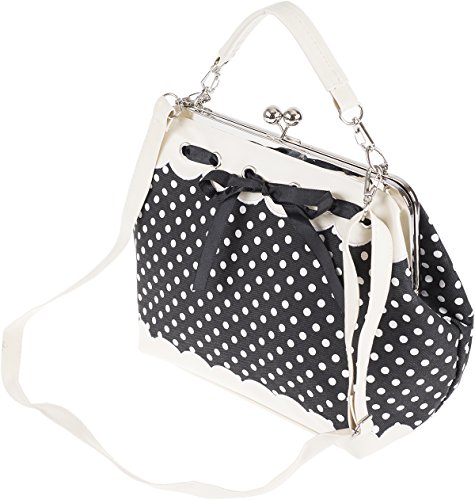 Wunderschöne Handtasche in zwei FarbenWahlweise in Schwarz oder Grün mit weißen DotsMit silberfarbenem Kisslock Verschluss Mit Karabinern befestigter Tragehenkel (abnehmbar)Zusätzlich mit Schulterriemen, verstellbar und abnehmbarVorne mit Einsätzen in gewellter Optik, die Wellenlinien sind gesticktIm oberen Bereich mit Ösen, durch welche eine Satinborte gezogen ist, als Schleife zu bindenFester Boden Großer Innenbereich, ein zusätzliches Innenfach mit Reißverschluss