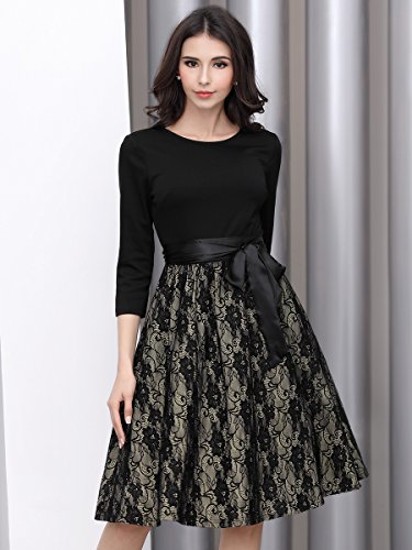 Miusol Damen Elegant Spitzenkleider 3/4 Arm Hochzeit Brautjungfer Schleife Abendkleider Schwarz Gr.S-XXL ****************************