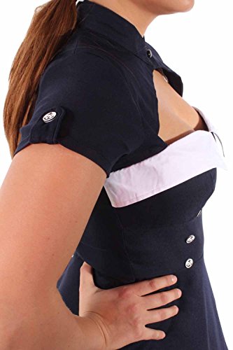 Größe auswählen: S (36-38), M (38-40), L (40-42), XL (42-44) oder XXL (44-46)Maße für S: ca. 105 cm lang, Brustumfang max. 90 cm, Taillenumfang max. 78 cmMaße für M: ca. 107 cm lang, Brustumfang max. 96 cm, Taillenumfang max. 82 cmMaße für L: ca. 109 cm lang, Brustumfang max. 100 cm, Taillenumfang max. 88 cmMaße für XL: ca. 111 cm lang, Brustumfang max. 106 cm, Taillenumfang max. 92 cmMaße für XXL: ca. 113 cm lang, Brustumfang max. 118 cm, Taillenumfang max. 106 cmFarbe: marineblau / weißMaterial: 80% Polyester, 20% ElasthanMarke: SugarShockLeinen los! Mit diesem atemberaubenden Petticoatkleid im fifties Style werden Seemanns Träume wahr 😉 Der Schulterbereich mit dem schmalen Stehkragen ist effektvoll im Bolero-Look gearbeitet. Das enge Oberteil und der extrem weit schwingende Tellerrock garantieren eine feminine Sanduhr Silhouette. Der Sailor Look ist mit Anker-Knöpfen im Taillenbereich und Zierbändern am Rock styletypisch optimiert. Ein langer Reißverschluss im Rücken sowie das angenehm stretchige Material sorgen für angenehmen Tragekomfort. Kann super mit oder ohne Petticoat getragen werden (dieser ist nicht im Lieferumfang enthalten, aber in unserem Shop erhältlich ebenso wie ein Uniform Schiffchen).