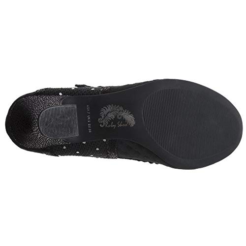Step out in style wearing Rosalind shoes by Ruby Shoo! Rosalind shoes come in a black discreet spotted material upper. Decorative metallic scalloped edge sits between the main shoe and the faux snake skin trim. The same trim leads to the adjustable buckle fastening. Extra detailing is provided with the spotted side section panels. Polka dot lining and striped insole completes the look. Black faux snake skin heel has a height of 8cm This shoe matches perfectly with the Como purse by Ruby Shoo Shoes are vegan friendly