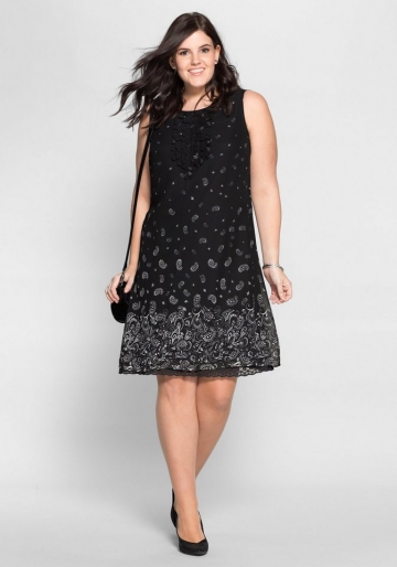 Produkttyp , Kleid, |Material , 100% Polyester, |Länge , Knielang, |Passform , Figurnahe Passform, |Ausschnitt , Runder Ausschnitt mit kleinen Rüschen darunter, |Ärmel , Keine Ärmel, |Schnittdetails , Jerseyfutter mit sichtbarer Spitze am Saum, |Optik , Mit Paisleydruck, |Gesamtlänge , Länge ca. 104 cm, |