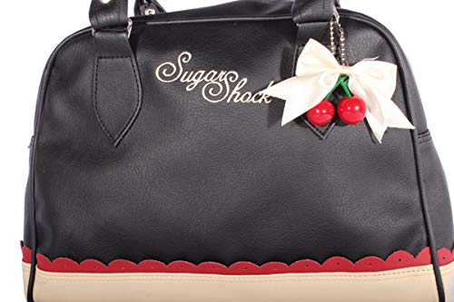 Material: gefüttertes PVC Marke: SugarShock Farbe: schwarz Größe: ca. 30 cm breit x ca. 23 cm hoch (ohne Henkel) x ca. 10 cm tief, die Henkel sind ca. 52 cm lang – also über Schulter tragbar abgerundete Henkel für einen angenehmen Tragekomfort verstärkter Boden mit kleinen Metall-Füßchen für guten Halt Diese Henkeltasche ist ein moderner Klassiker, der mit dem nötigen Flair den gewünschten retro Akzent setzt. Eine reizvolle Budapester-Optik mit süßem Satin-Schleifchen und Kirschen-Anhänger. Die farblich abgesetzte Rüsche trennt den Hauptbereich vom creme-farbenen Rand. Im Frontbereich mit effektvoller Logo Stickerei. Durch die kleine Innentasche mit Zipper findet alles problemlos seinen Platz.