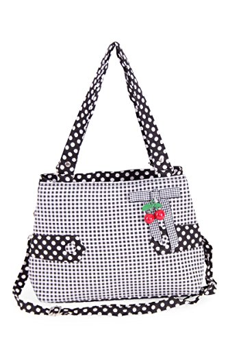 Die karierte Tasche ist verschliessbar durch 2 Reißverschlüsse, ist in 2 praktischen Fächern aufgeteilt und hat Innen eine kleine, verschliessbare Innentasche eingearbeitet. Der flache Tragehenkel und der längenverstellbare Schultergurt sorgen für angenehmen Tragekomfort.Der niedliche 2-tone Look, die Uniformtypischen Zierklappen, und der große PVC Kirschanhänger machen die Tasche zum absoluten Hingucker der Saison! Eine wunderschöne Tasche, in ausgefallener Form…..die enorm viel Stauraum für allen Schnick Schnack bietet!Marke: SugarShockFarbe: schwarz weiß