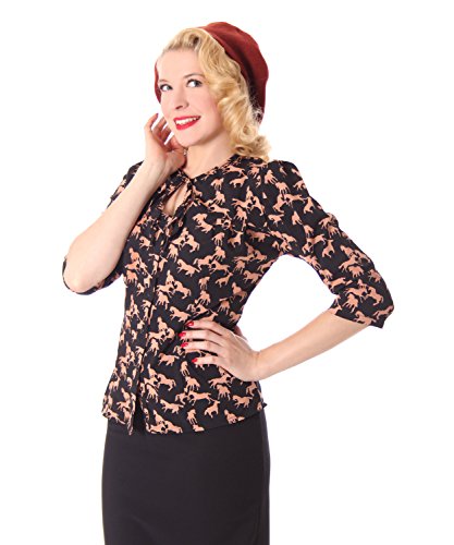 Das figurnahe Oberteil aus leichtem, dehnbaren Blusenmaterial, ist schön tailliert geschnitten und schmiegt sich angenehm den Körperformen an.Das elegante Pferde Muster, die klassischen 3/4 langen Puffärmel und der raffinierte Schlüssellochausschnitt, sind ein echter Blickfang.Die Bluse liegt dank des stretchigen Blusenstoffes sehr angenehm auf der Haut, und zeichnet reizend elegant die weiblichen Formen nach.Die Bluse ist durchgehend geknöpft, und der Ausschnitt wird mit einem Bindeband neckisch geschlossen.Mit dieser niedlichen Bluse hat SugarShock die 40er Jahre authentisch inszeniert.Die Bluse überzeugt durch optimalen Tragekomfort, ist ein vielseitiger Klassiker, bringt Wohlfühlfaktor und ist absolut Bürotauglich.Die Bluse fällt normal groß aus, unser Model Kessy trägt auf den Bildern Gr. S.Perfekt zur Marlenehose oder zu unseren Swing- und Pencilröcken kombinierbar. Marke: SugarShockFarbe: cremé apricot Da Bekleidung größentechnisch immer sehr unterschiedlich ausfällt, beachten Sie bitte folgende Maßangabenca Maße S – Brustumfang bis max 92cm, Taillenumfang bis max 76cm, Länge 59cmca Maße M – Brustumfang bis max 98cm, Taillenumfang bis max 84cm, Länge 60cmca Maße L – Brustumfang bis max 104cm, Taillenumfang bis max 90cm, Länge 62cmca Maße XL – Brustumfang bis max 110cm, Taillenumfang bis max 99cm, Länge 65cmca Maße XXL -Brustumfang bis max 114cm, Taillenumfang bis max 106cm, Länge 66cm