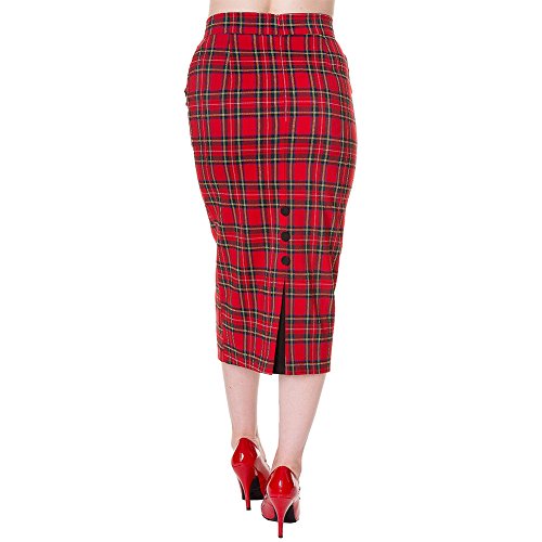 Tiger Milly – Banned 50s Vintage Stil Tartan Figurbetonter Stiftrock – Rot, EU 36 – Schöner 50s Stil Rock hergestellt aus Rotem, grünem & Gelben Tartan Stoff. Geschichtete Taschen zum herunter-falten auf der Front. Unsichtbarer Reißverschluss auf der Mitte der Rückseite. Gehfalte auf der Rückseite des Rockes zur Erleichterung der Bewegung ausgeführt mit Dekorativen Knöpfen. Separates Slip/Ruck Futter (befestigt an der Hüfte und Reißverschluss aber nicht an den Seiten). – Abmessungen: EU 36 = Taille 65cm Hüfte 83cm Länge 73cm; EU 38 = Taille 70cm Hüfte 88cm Länge 75cm; EU 40 = Taille 75cm Hüfte 93cm Länge 75cm; EU 42 = Taille 80cm Hüfte 98cm Länge 75cm; EU 44 = Taille 85cm Hüfte 103cm Länge 78cm; – Viel mehr 50s Stil Bekleidung erhältlich zum Kauf bei Tiger Milly.